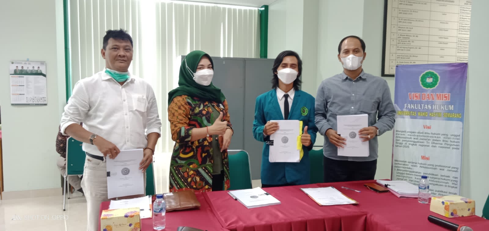 Mahasiswa fakultas hukum tersebut, dinyatakan lulus setelah di uji skripsinya oleh tiga dosen di lantai 5 gedung dekanat Universitas Wahid Hasyim Semarang. Diantaranya yang menguji adalah Dr. Shidqon Prabowo, S.H., M.H., Dr. Arum Widiastuti, S.H., M.H., dan Anto Kustanto, S.H., M.H.