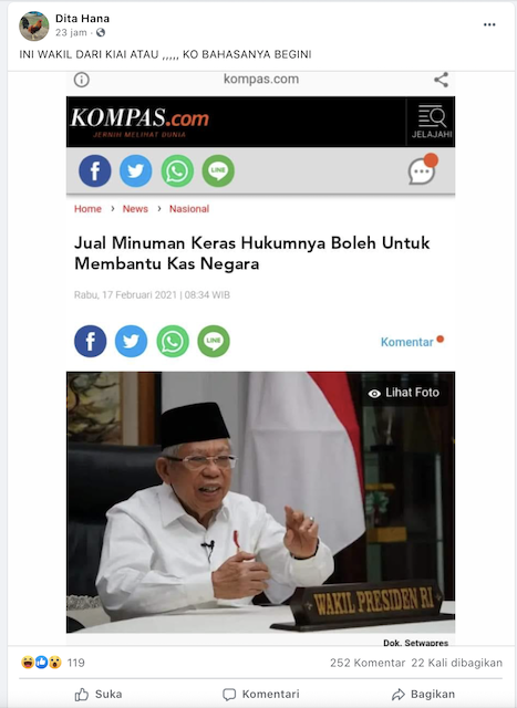 Tangkapan layar itu kadung viral di media sosial lantaran wapres Ma’ruf diklaim memberikan pernyataan bahwa investasi miras akan meningkatkan kas negara. Tentu saja hal ini mengundang reaksi masyarakat. Sebab, seolah-olah wapres Ma’ruf yang dikenal sebagai ulama itu melegitimasi Perpres yang baru saja diteken oleh pemerintah.