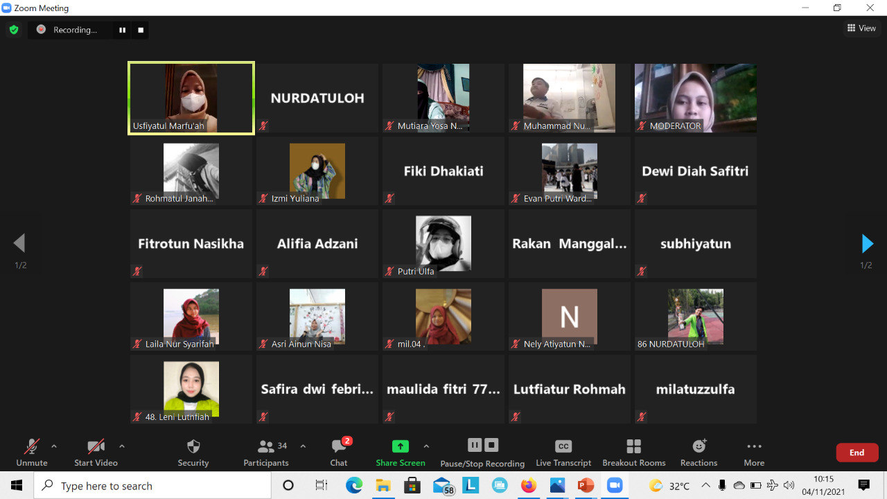 Kegiatan webinar diawali dengan sambutan dari koordinator kelompok 50 KKN UIN Walisongo Semarang yang diisi oleh saudara Andre Afriyanto dan dilanjutkan oleh pemateri ibu Usfiyatul Marfuah, M.Si.