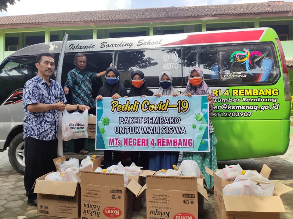 Untuk itu, demi membantu meringankan beban sebagian masyarakat yang terdampak Covid-19, Madrasah Tsanawiyah Negeri 4 Rembang (MTs N 4 Rembang) melakukan sebuah kegiatan sosial. Kegiatan sosial ini diselenggarakan dengan membagikan 540 paket sembako kepada orang tua atau wali murid MTs N 4 Rembang (13/4/2020).