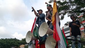 Sebelum melakukan aksi demo di depan gedung DPRD, mahasiswa berkumpul di Taman Budaya Raden Saleh yang dipimpin oleh korlap aksi.